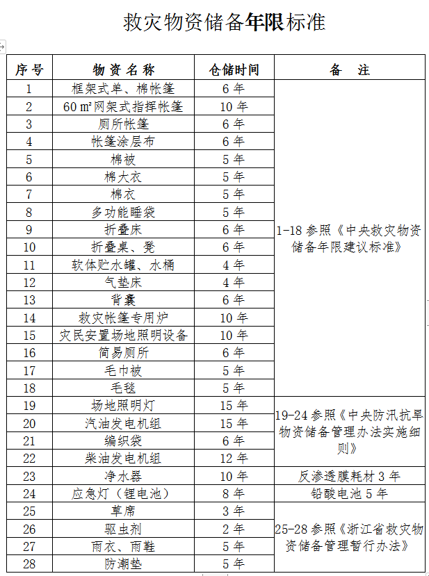 第二十九条救灾物资储备年限依据国家有关规定和各类物资老化试验结果等因素确定,按首次验收入库时间起计算(救灾物资储备年限详见附件)。