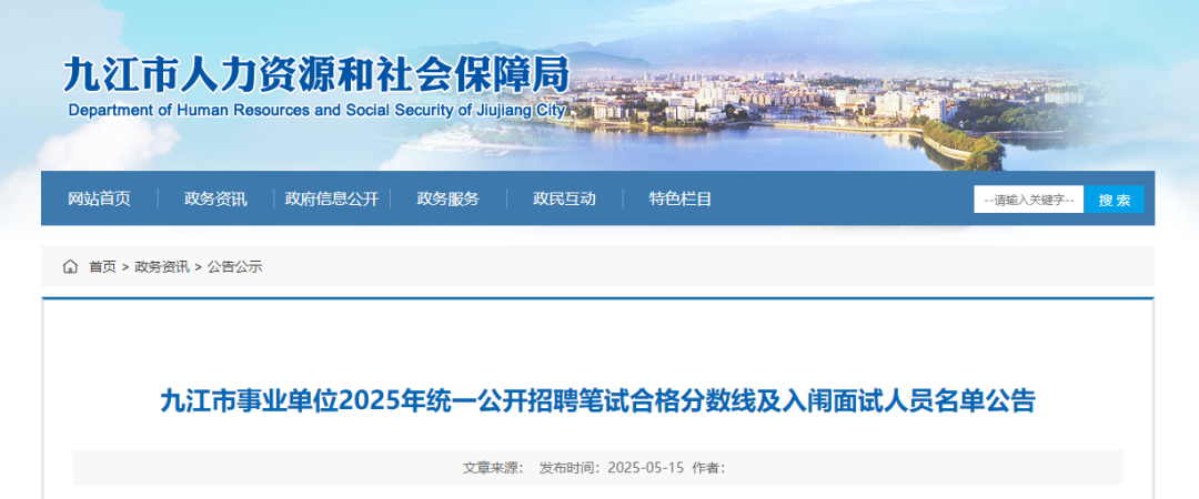 根据《九江市事业单位2025年统一公开招聘工作人员公告》及相关规定,现将九江市事业单位2025年统一公开招聘笔试合格分数线及入围面试人员名单公告如下: