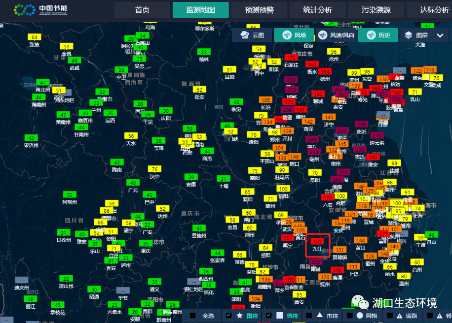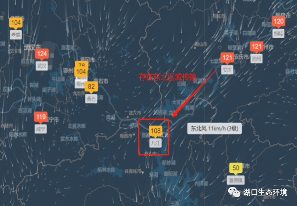 1、区域传输:昨日以东北风为主,风速5.2m/s,为3级风,区域性污染严重,与九江市毗邻的湖北省(武汉147μg/m3、咸宁135μg/m3)、安徽省(安庆167μg/m3、池州136μg/m3)及江西省(南昌108μg/m3)均不同程度出现轻度以上污染,在此风向下,我县持续14个小时重度污染,21时PM2.5浓度达到峰值172μg/m3(重度污染)。