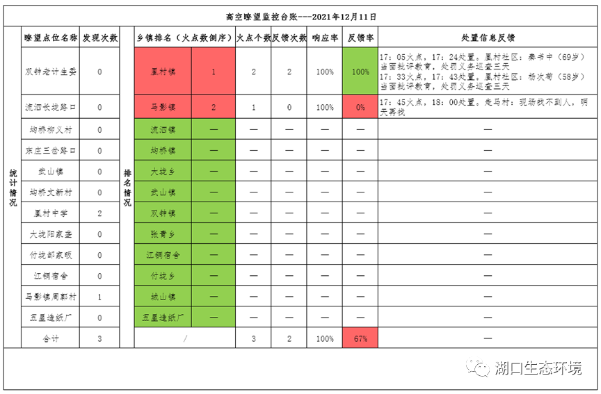 依据“有火必究、有火必查”原则,各个乡镇对每日发现的火点情况需做到全面扑灭且在30分钟之内处置完毕并反馈,方可视为有效反馈。如上表所述,湖口县昨日秸秆焚烧情况综合响应率为100%、反馈率为67%。