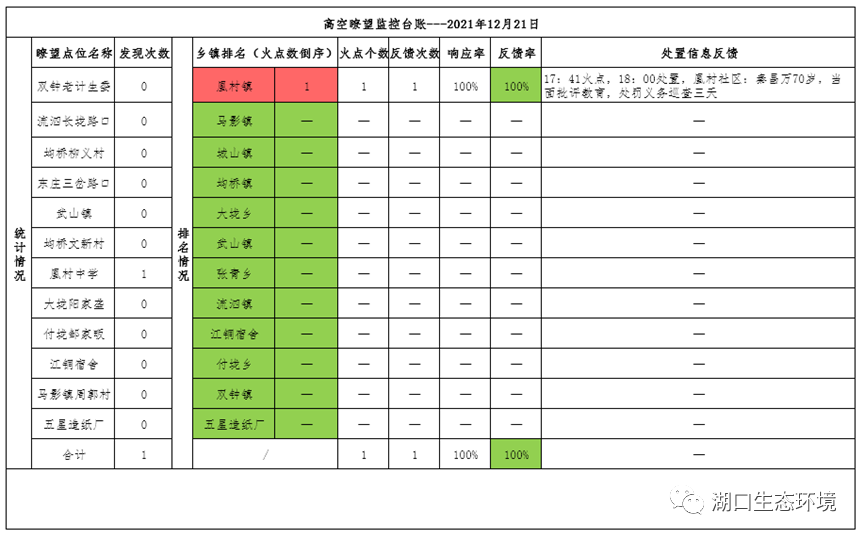 依据“有火必究、有火必查”原则,各个乡镇对每日发现的火点情况需做到全面扑灭且在30分钟之内处置完毕并反馈,方可视为有效反馈。如上表所述,湖口县昨日秸秆焚烧情况综合响应率为100%、反馈率为100%。