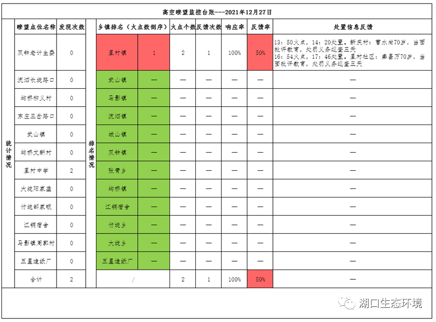 依据“有火必究、有火必查”原则,各个乡镇对每日发现的火点情况需做到全面扑灭且在30分钟之内处置完毕并反馈,方可视为有效反馈。如上表所述,湖口县昨日秸秆焚烧情况综合响应率为100%、反馈率为50%。