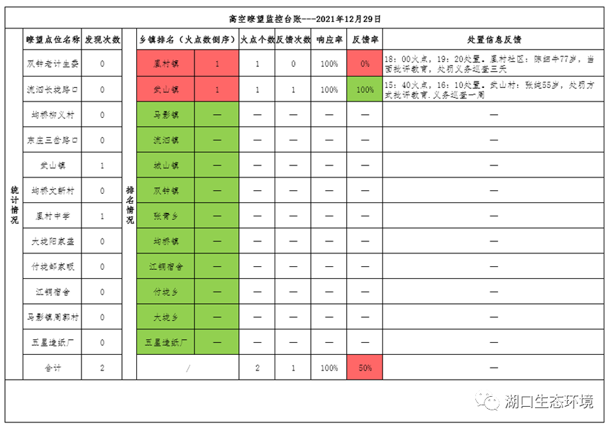 2021年12月29日湖口县高空瞭望火点发现及反馈情况如表1所示(截止反馈时间为昨日22点)。昨日共发现火点2处,其中凰村镇1处、武山镇1处。依据“有火必究、有火必查”原则,各个乡镇对每日发现的火点情况需做到全面扑灭且在30分钟之内处置完毕并反馈,方可视为有效反馈。如上表所述,湖口县昨日秸秆焚烧情况综合响应率为100%、反馈率为50%。