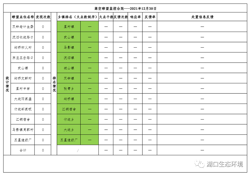 2021年12月30日湖口县高空瞭望火点发现及反馈情况如表1所示(截止反馈时间为昨日22点)。昨日未发现火点。