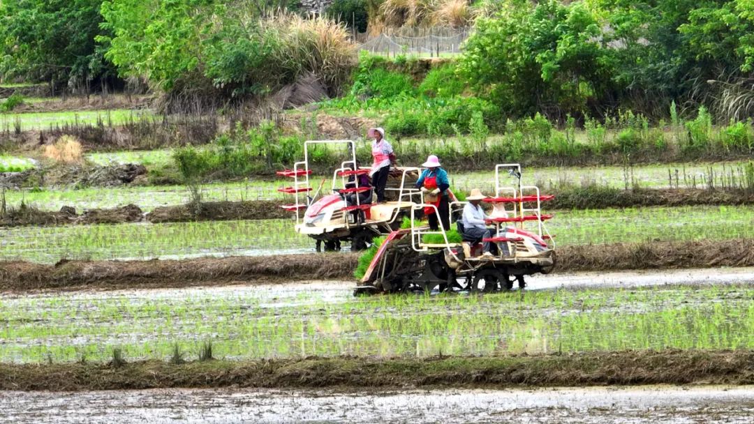 “我们正在和时间赛跑抢插中稻。”南湾村经济合作社负责人周金怡介绍,中稻生长期约130多天,必须在6月20日之前完成插播,否则将严重影响后期生长、抽穗扬花和最终产量。他算了一笔效率账:传统人工插秧,一人一天仅能完成约0.8亩;而使用一台高速插秧机,日作业量可达30亩至40亩。“机械化作业不仅大幅节省了人工成本,更让我们村的中稻插播任务在短短3天内就全部完成。”周金怡说。