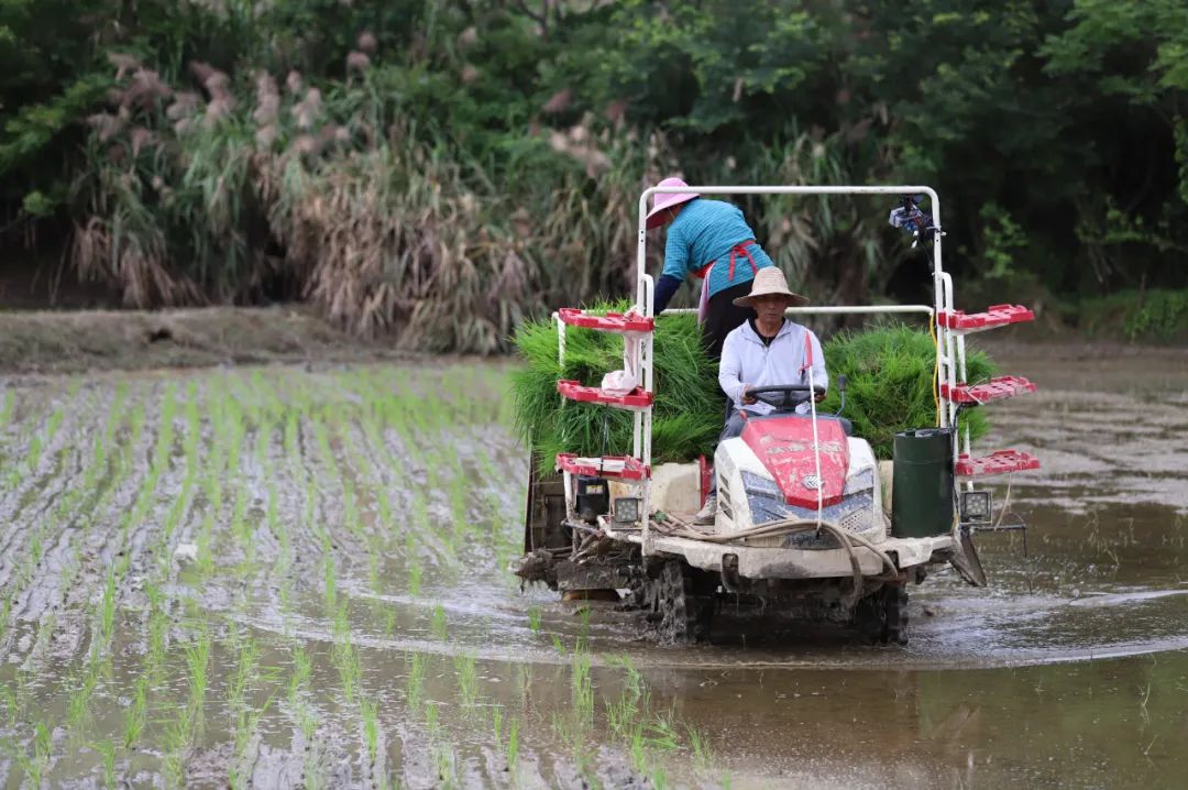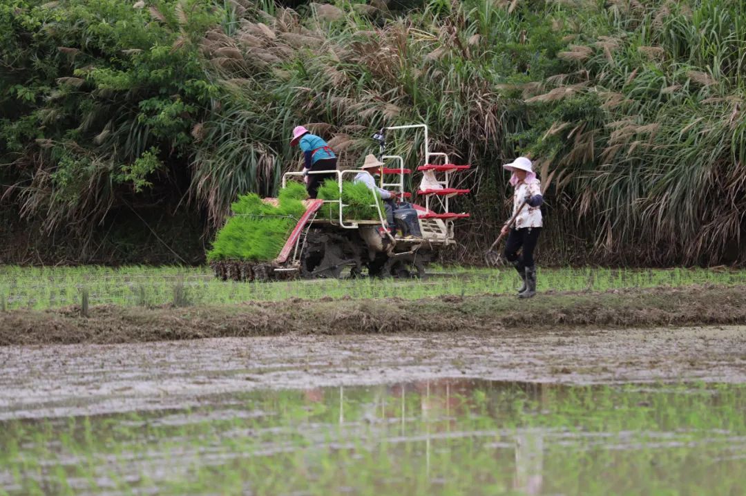 在南湾村的稻田里,嫩绿的秧苗从高速运转的插秧机苗盘上精准滑落,稳稳植入肥沃的水田,迅速为大地铺上新绿。所过之处,秧苗行距整齐划一,展现出机械化作业的高效与精准。