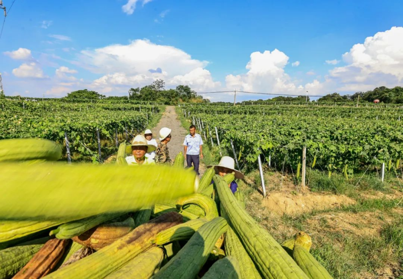 一大早,基地里早已热闹非凡。村民们穿梭在葱郁的藤蔓间,眼疾手快地将成熟的丝瓜络摘下,动作行云流水,不一会儿筐中便堆满了带着晨露的果实。眼下,光照充足,丝瓜络也迎来了丰收。放眼望去,采摘工人们顶着烈日,分工协作,穿梭在藤架间,忙着将符合规格的丝瓜络采摘装车。