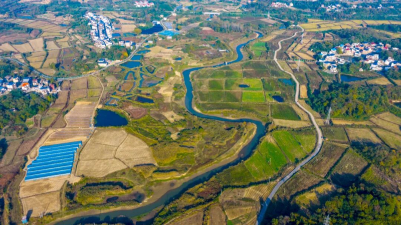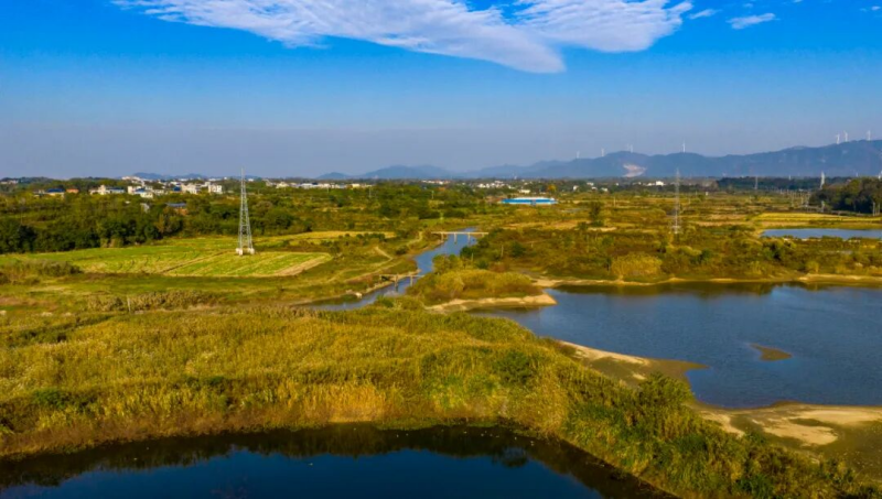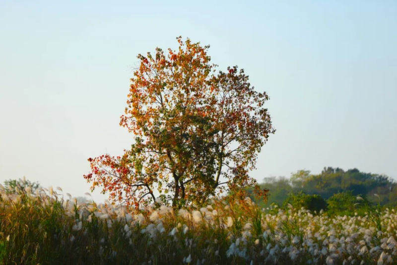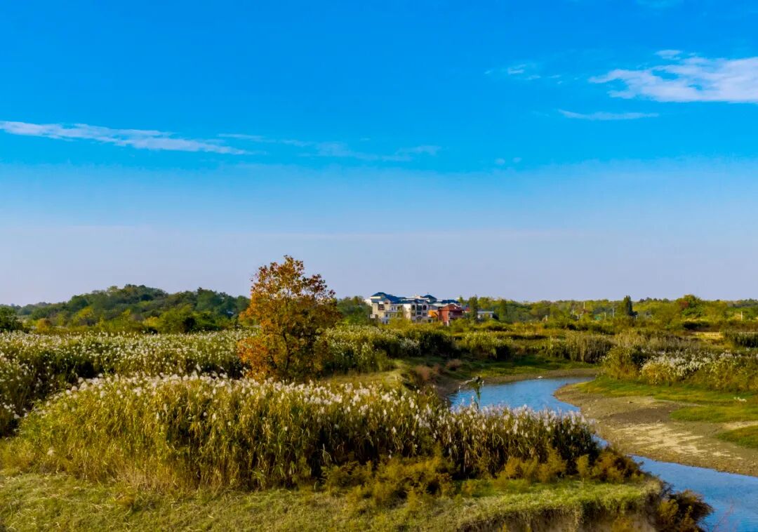 初冬时节,湖口县五里河流域均桥镇高塘村、文联社区、文桥村段两岸的连片芦荻花开正盛,轻柔的荻花随风摇曳,灿然欲飞,远望白茫茫一片,与附近的美丽村庄、蜿蜒村道、弯曲河道和规整田块相谐相生,构成一道乡村特有的冬日美景。