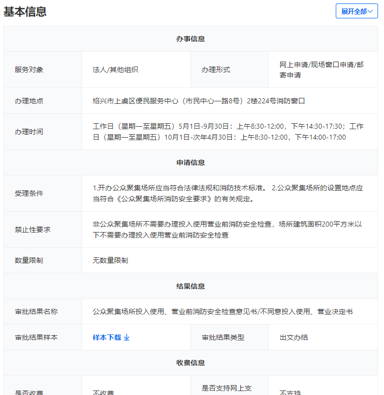 https://www.zjzwfw.gov.cn/zjservice-fe/#/workguide?localInnerCode=cbb7eca1-cf3f-49b4-8fd6-b337d0434a6d&siteCode=330604000000 | 3 | 15 | 1.政策依据:《中华人民共和国消防法》、《建设工程消防设计审查验收管理暂行规定》 2.办理形式:窗口办理 |