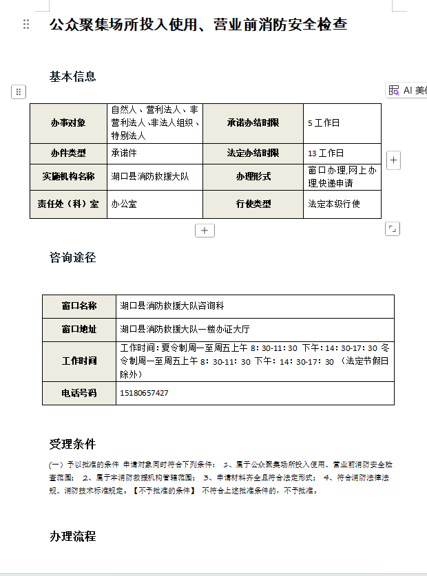 | 21 | 湖口县消防救援大队 | 公众聚集场所投入使用、营业前消防安全检查 | 行政许可 | 己同事同标,申请材料、办结时限、办理标准及方式已对标浙江上虞 | 6 | 5 | 是 | 根据《中华人民共和国消防法》第十五条 公众聚集场所投入使用、营业前消防安全检查实行告知承诺管理。公众聚集场所在投入使用、营业前,建设单位或者使用单位应当向场所所在地的县级以上地方人民政府消防救援机构申请消防安全检查,作出场所符合消防技术标准和管理规定的承诺,提交规定的材料,并对其承诺和材料的真实性负责。 消防救援机构对申请人提交的材料进行审查;申请材料齐全、符合法定形式的,应当予以许可。消防救援机构应当根据消防技术标准和管理规定,及时对作出承诺的公众聚集场所进行核查。 申请人选择不采用告知承诺方式办理的,消防救援机构应当自受理申请之日起十个工作日内,根据消防技术标准和管理规定,对该场所进行检查。经检查符合消防安全要求的,应当予以许可。 公众聚集场所未经消防救援机构许可的,不得投入使用、营业。消防安全检查的具体办法,由国务院应急管理部门制定 |