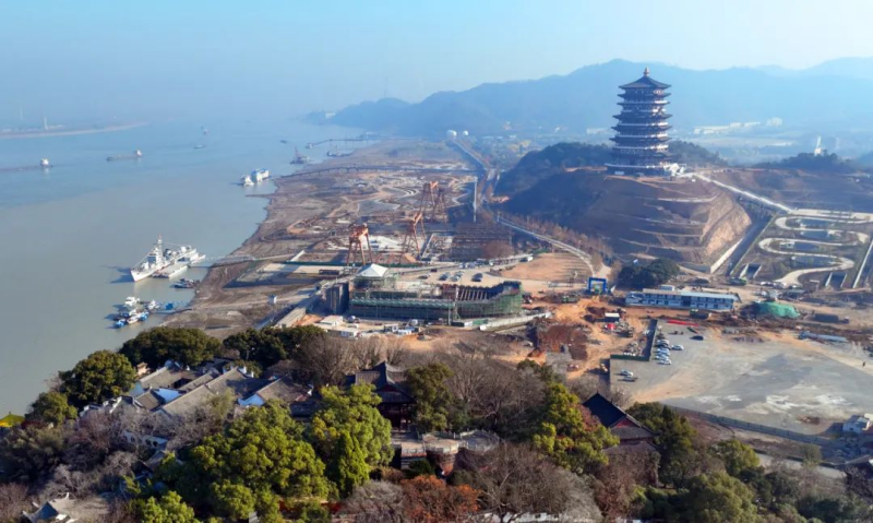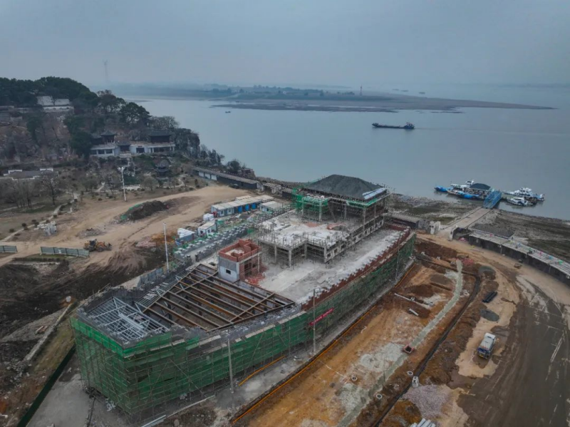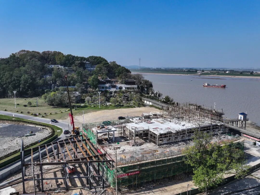 日前,位于九江舰军事文化主题乐园西侧的文旅项目“一揽江湖”,主体工程基本完工,外立面造型及幕墙正在施工,室内装修同步进行,外围的道路、管网等配套设施正在加速推进。现场机械轰鸣、车辆穿梭,一派热火朝天的建设场景。