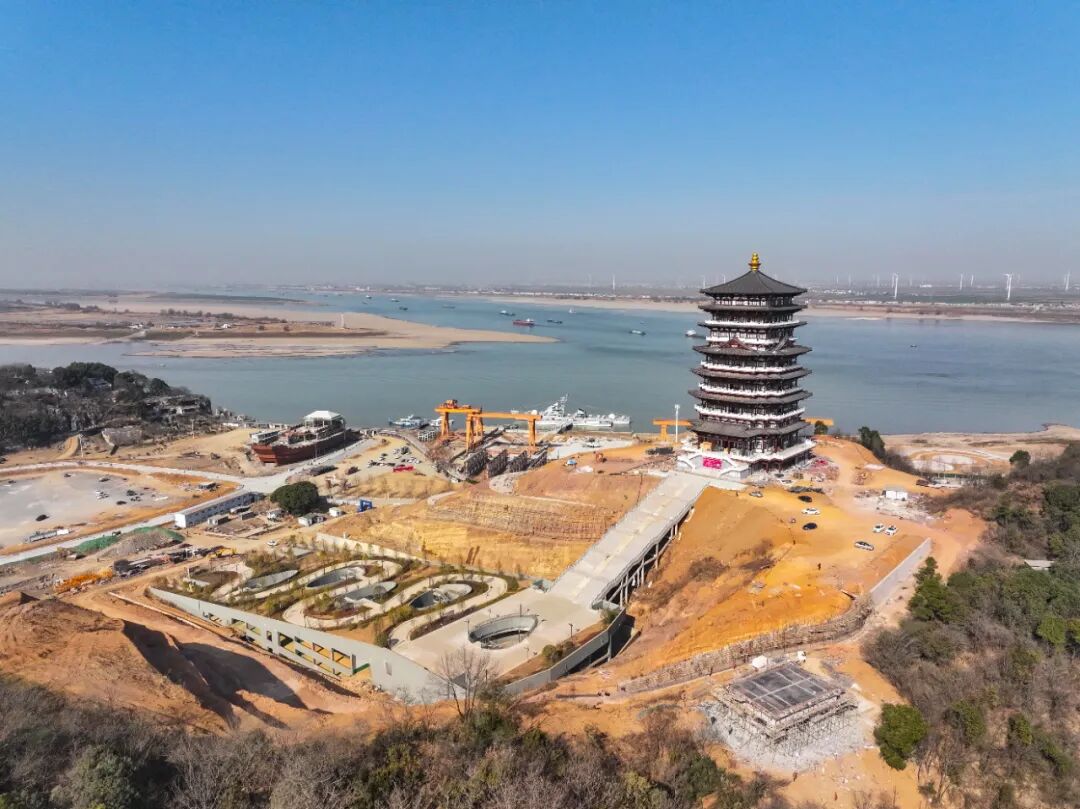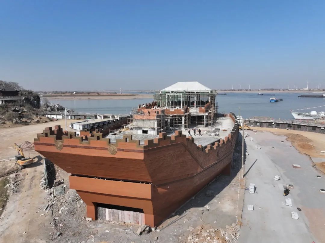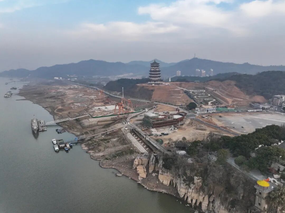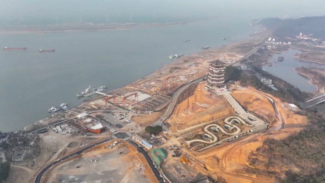 石钟楼内,古建装修师傅们,正忙着布展隔墙板的安装。消防通道旁,土建工人正在制模、绑扎钢筋、砌护坡体;等比例仿制的明清古战船上,工人们正在抢铺坡屋顶;九江舰军事文化主题乐园内正在拆卸龙门吊、浇筑旱喷基础;长江国家文化公园(湖口段)正在完善游步道铺装……