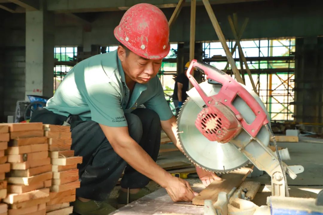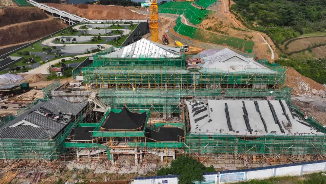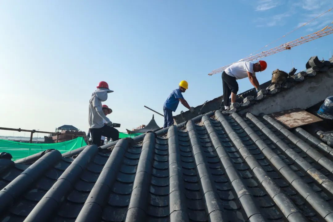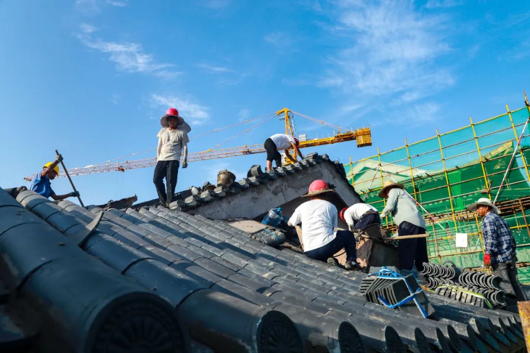 近日,记者走进湖口县在建的文旅项目石钟山景区游客中心建设现场,只见施工班组有的在铺装筒瓦,有的在安装斗拱,有的在对主楼进行二次结构,一派繁忙有序的建设场景。
