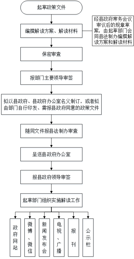 (三)规章草案通过县政府常务会议审议后,起草部门会同县法制办组织编撰解读方案和解读材料,与规章草案一并报批。其中,起草部门负责实施要点、操作指南等内容,县法制办负责条文解读和相关法律问题解释。县政府办公室按照程序将政策文件和解读方案、解读材料一并报县政府领导。县政府领导审签后,起草部门按照解读方案,组织实施解读工作。
