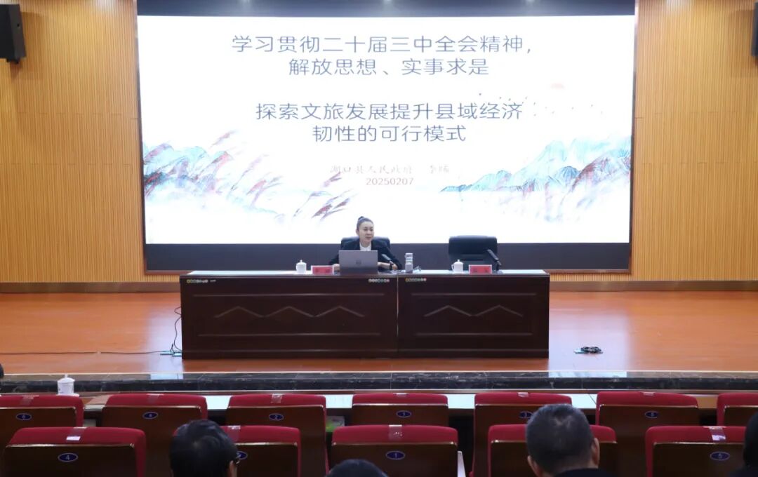 副县长李晞以《学习贯彻党的二十届三中全会精神,解放思想、实事求是,探索文旅发展提升县域经济韧性的可行模式》为主题进行授课。