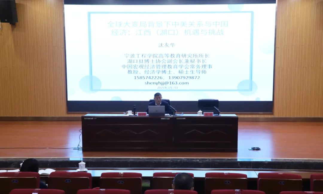 宁波工程学院高等教育研究所所长、教授、博士沈友华以《全球大变局背景下中美关系与中国经济:江西(湖口)机遇与挑战》为主题进行授课。