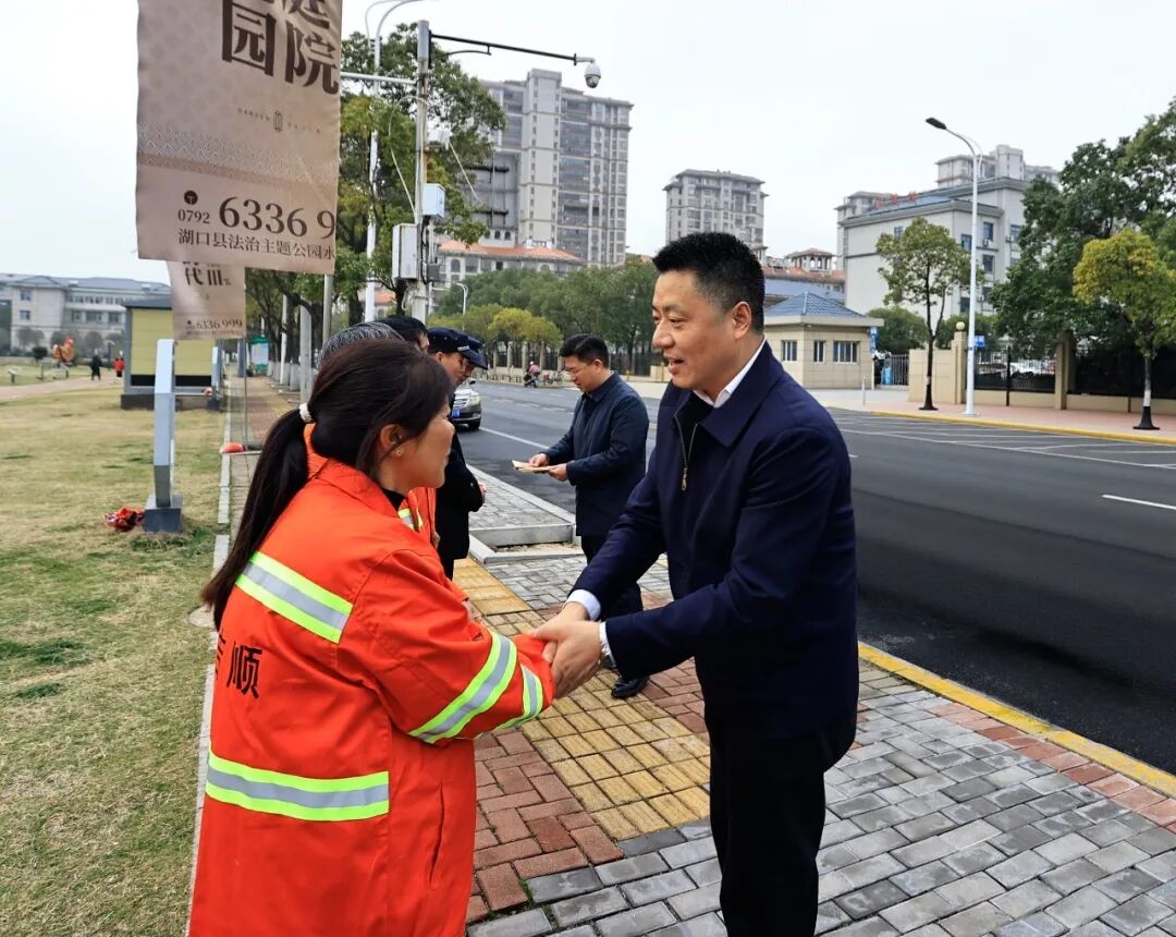 市政公用事业关乎群众生活品质。来到县法治主题公园,曾宝柱看望慰问坚守岗位的环卫工人和城管队员代表,了解城市管理和环境卫生等情况。他指出,环卫工人是城市的美容师。正是大家的辛勤劳动,把城市打扫得干干净净、清清爽爽、整整洁洁、漂漂亮亮,更加彰显出湖口的城市环境。节日期间,市政等相关部门要全力做好供水、供气、供电等保障工作,让人民群众过上一个欢乐祥和、平安幸福的春节。