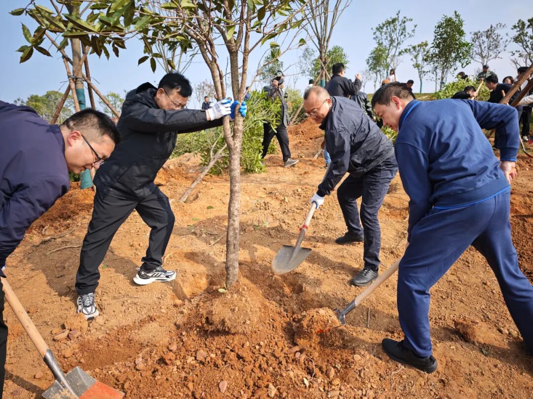 植树点依照园区绿化规划,采取乔、灌、草搭配的方式,以种植乔木为主,主要树种为红榉、桂花、樱花等。当天上午,大家一起挥锹掘土、扶正苗木、细心培土,用心种下一片新绿,每道工序、每个环节都做得认真细致。
