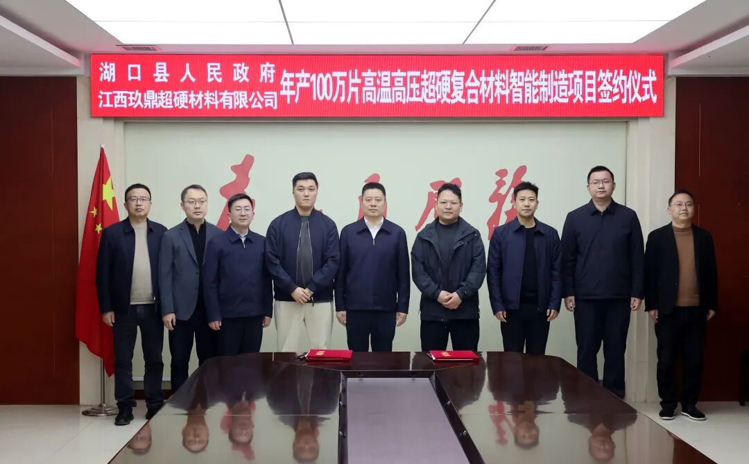 3月12日,湖口县人民政府与江西玖鼎超硬材料有限公司举行年产100万片高温高压超硬复合材料智能制造项目签约仪式。江西六方钻科技有限公司总经理陆康,江西玖鼎超硬材料有限公司总经理、宁波大学物理科学与技术学院教授潘益龙,县委书记曾宝柱,县委副书记、县长陈洋,副县长马达及相关单位负责同志出席签约仪式。
