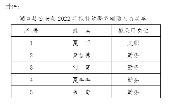 根据《江西省公安机关警务辅助人员条例》、《湖口县公安局2022年度公开招聘警务辅助人员的公告》等有关要求,拟补录夏平等5名同志为湖口县公安局警务辅助人员,现予以公示(名单见附件)。公示期为7个工作日,如对拟补录人员的录用资格有异议,请向湖口县公安局政工监督室反映。