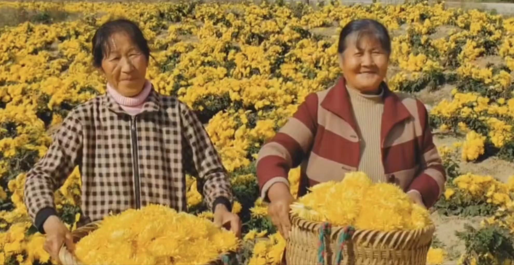 近日,在张青乡张青芊芸生态休闲药谷,金黄的菊花散发着阵阵清香,村民们有序地进行采收和分拣工作,忙碌又喜悦。