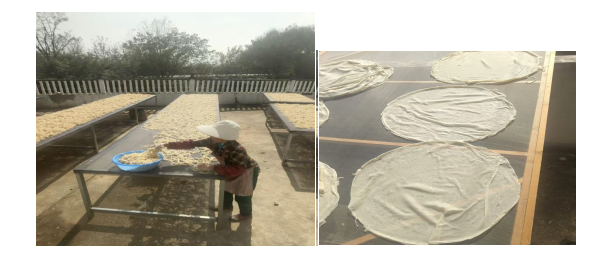 近年来,由于农村大量青壮年劳动力都外出务工,留守在家的都是老年人、妇女和孩子,大垅乡户户都烫豆粑的模式也发生了变化。从11月份开始,大垅乡阳垅村都要手工制作大量的豆粑,调豆粑浆、烫豆粑饼、卷豆粑饼、切豆粑丝、等工序,最后将切好的豆粑丝均匀摊开,晒在竹制的筛子里,趁着天气晴好,大概两三天的功夫,豆粑就晒干了,然后通过互联网销售到千家万户。“小豆粑”让村部负责人每天忙碌不已,也让整个村部处处弥漫着浓浓的豆粑香。