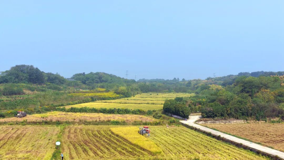 金秋十月,稻浪翻滚,谷香弥漫。在凰村镇双桥村的广袤田野上,一片金黄映入眼帘,沉甸甸的稻穗压弯了稻秆,传递着丰收的喜悦。近日,双桥村股份经济合作社的近300亩晚稻种植基地内,两台大型收割机正开足马力,在稻田里来回穿梭、高效作业。伴随着机器的轰鸣声,金黄的稻穗被迅速卷入机器,完成脱粒后,饱满的谷粒如同金色的瀑布,通过输送管哗哗地“流”入等候在田边的运粮车中。田间地头,村民们脸上洋溢着笑容,一派繁忙而有序的丰收景象。