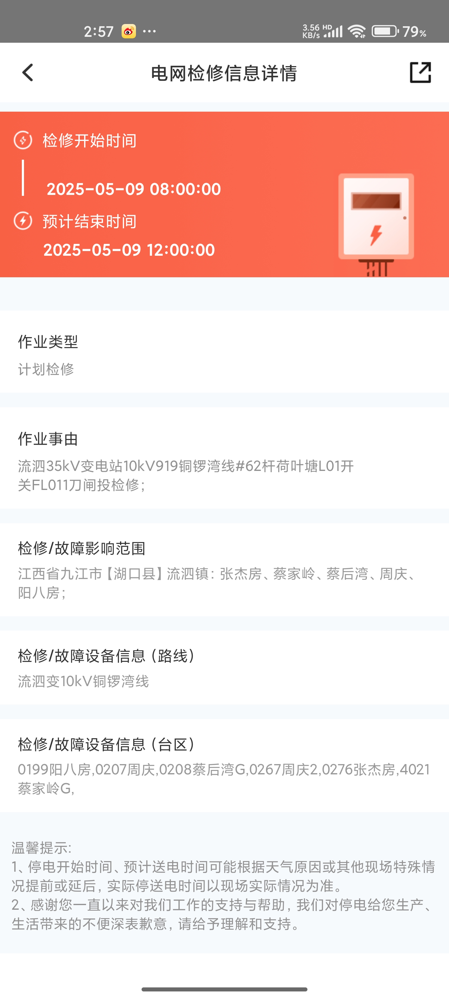 计划检修:流泗35kV变电站10kV919铜锣湾线#62杆荷叶塘L01开关FL011刀闸投检修;