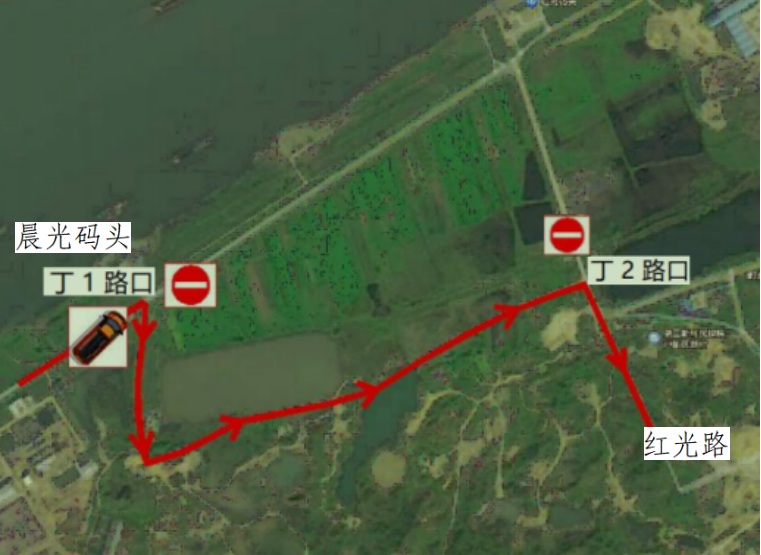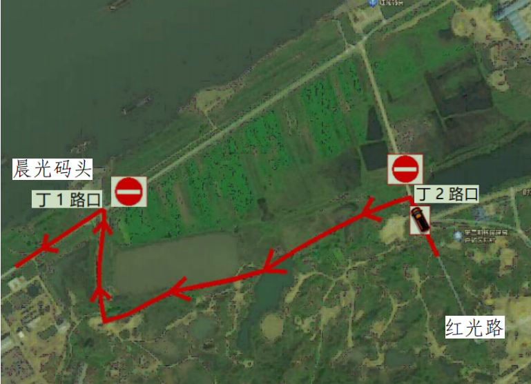 (一)湖口县方向来车,在丁1路口右转走现有市政道路,经过丁2路口右转上红光路前往彭泽方向。如下图一
